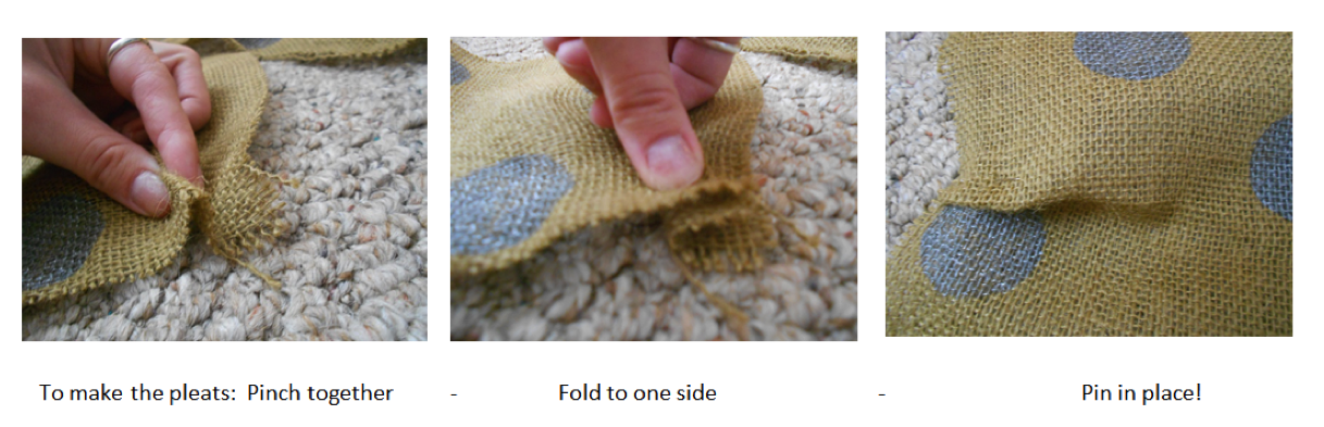 6. Now it’s time to ruffle all of that burlap! To do this, just fold, pleat, and pin every three to four inches or so at the top of the burlap. For the last two rows of burlap (the closest to the center) I made the ruffles closer together.