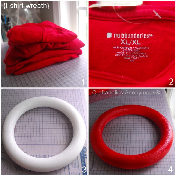- I used 4 t-shirts to make my wreath, but you may need more or less depending on the size of the shirts you use. I snagged these for $1-2 each at the thrift store.