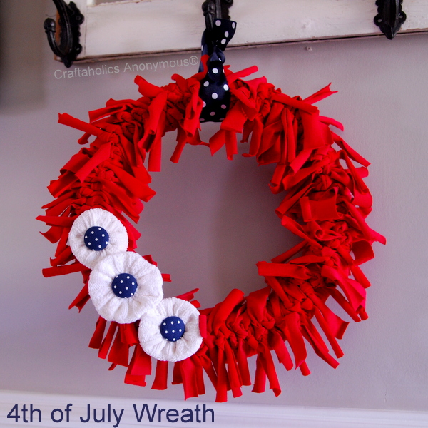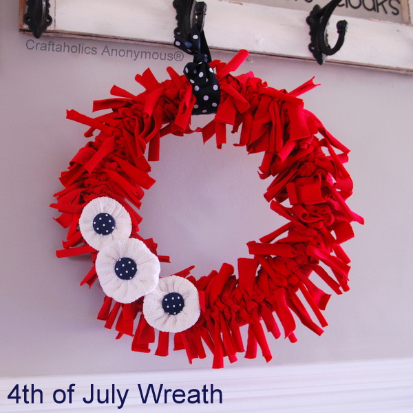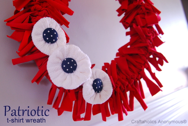 Happy Tuesday, Crafters! Hope your week is going nicely. I finished my 4th of July wreath yesterday and its totally cute!! Its shaggy, patriotic, and adorable! Oh, and its made from t-shirts. Yep, another use for all those tees laying around!