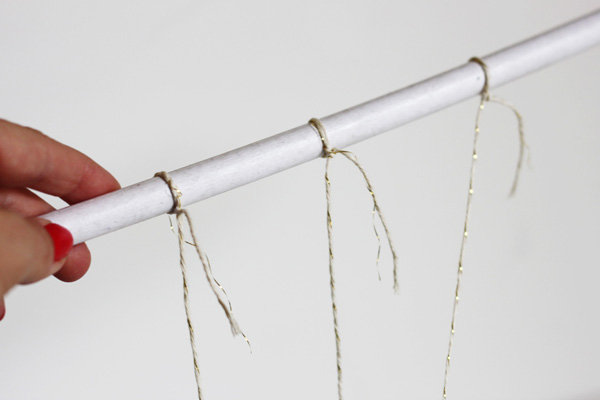 Begin by cutting out the printed shapes (keeping the fronts and backs together so it doesn’t get confusing). Next, remove the top of the hanger (the wire part) and tie on three pieces of twine in different lengths. (Experiment with more pieces of twine or ribbon depending on the look you want).