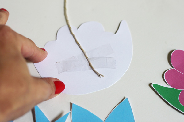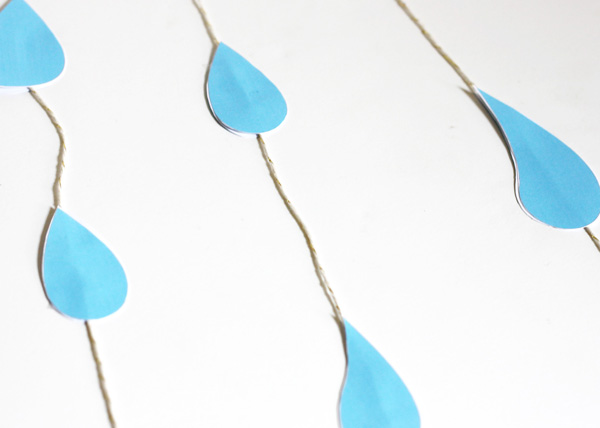 At the bottom of each piece of twine, use your double sided tape to tape the back of the flower to the twine. Then add the front of the flower so it’s two sided. Once you have added the flowers to the bottoms, work your way up each piece of twine adding raindrops. I liked about 3 per string.