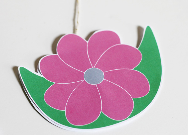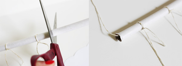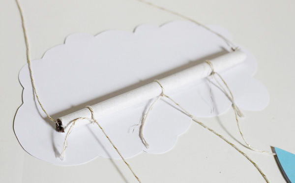 Now that you have the april showers and may flowers attached, trim down your cardboard tube and string another piece of twine through it. You’ll use this to hang your mobile.
