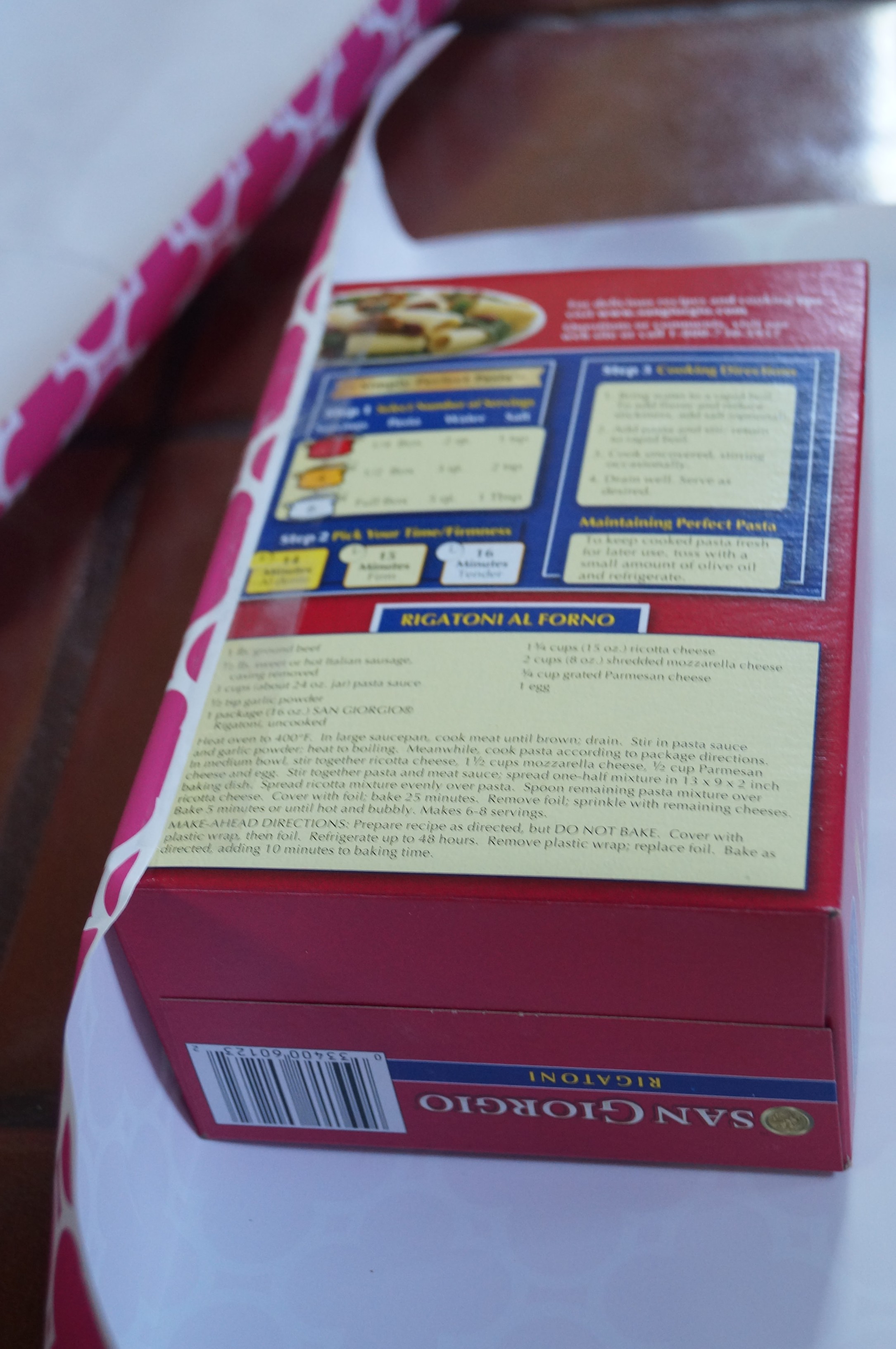 1 cereal box, 1 pasta box, wrapping paper of your choice and clear tape