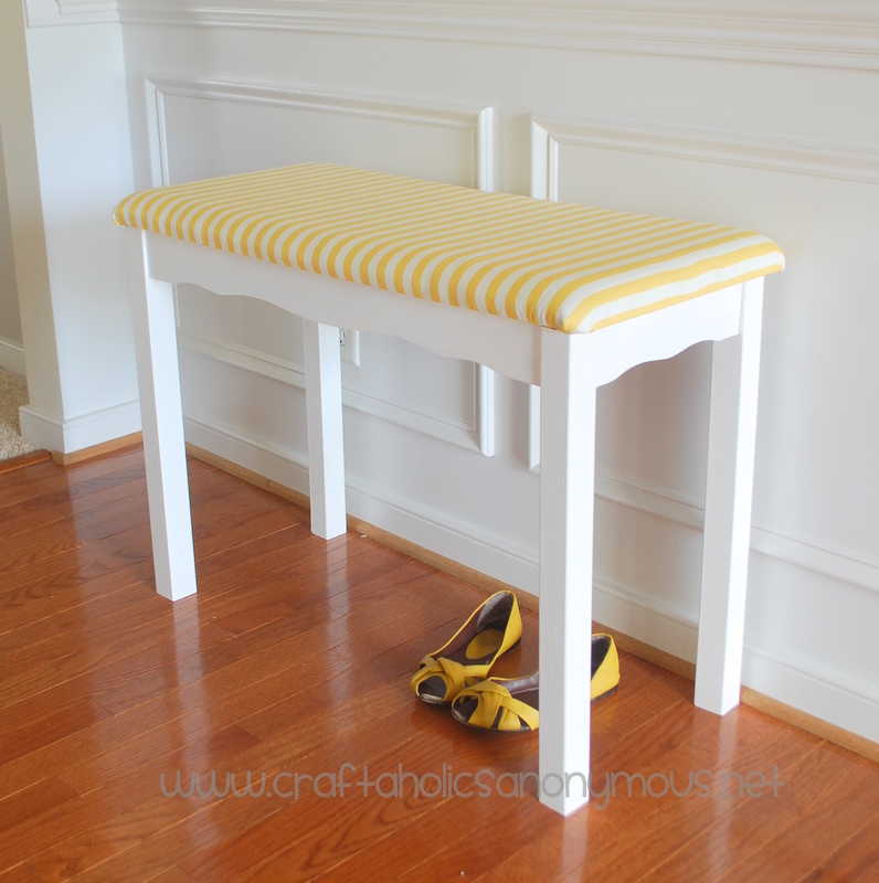 Upholstered the top or seat of the now bench using this easy upholstering tutorial. The only thing we did different was add a layer of white fabric before the yellow stripes so that the green foam didn’t show through.