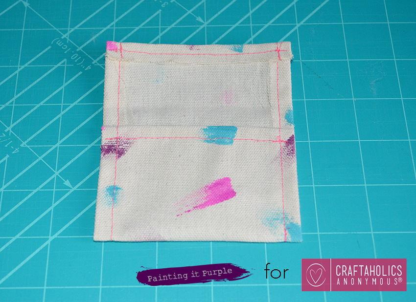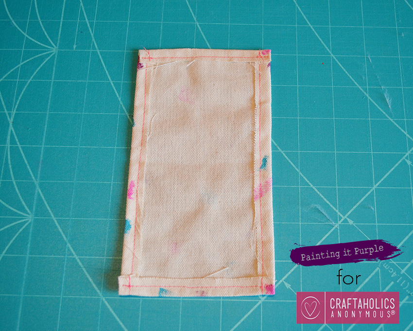 Step Three: Sew your edges. Fold over about half an inch all the way around your canvas and sew. I used bright pink thread because I wanted to see the stitch but if you want a hidden stitch, use a thread that matches your canvas.