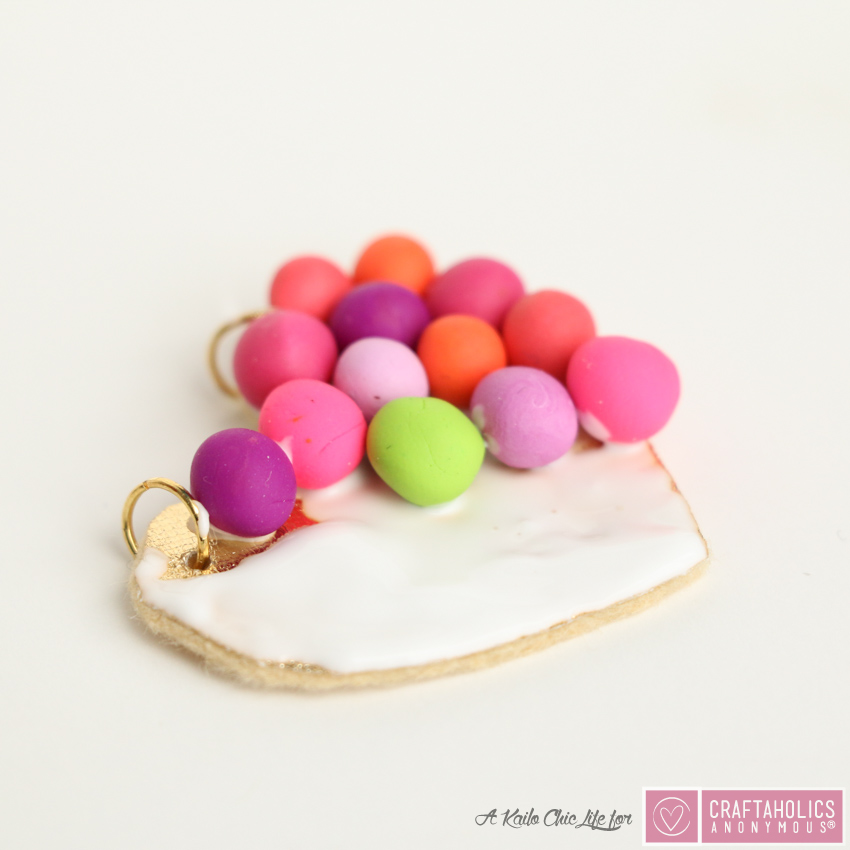 You are now ready to assemble your mini pompom heart necklace! First you will want to punch two small holes at the top of your felt heart and attach the jump rings. Then you will cover the entire felt heart with glue and start arranging and gluing down your mini clay pompoms to create your pompom heart charm.
