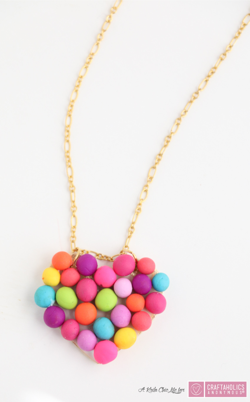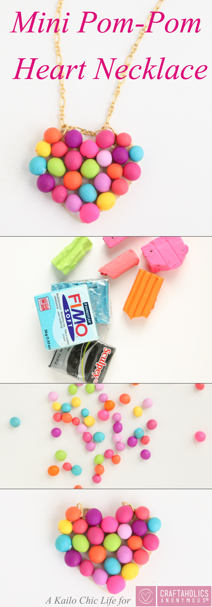 Hi! Kara from A Kailo Chic Life here. I am so excited to show you all how to make this super adorable DIY mini pompom heart necklace. I don’t know about you, but I currently have an obsession with felt balls and pompoms. Over the holidays I loved seeing everyone’s felt ball wreaths, but I don’t have the time or patience to glue 200+ felt balls to a wreath. So instead, I decided to get my pompom fix in mini form with the use of polymer clay! This DIY mini pompom heart necklace is a great project for kids and adults and everyone will be eyeing your adorable colorful pompom necklace when you are done.
