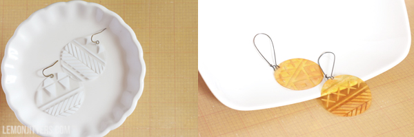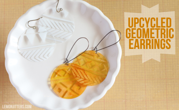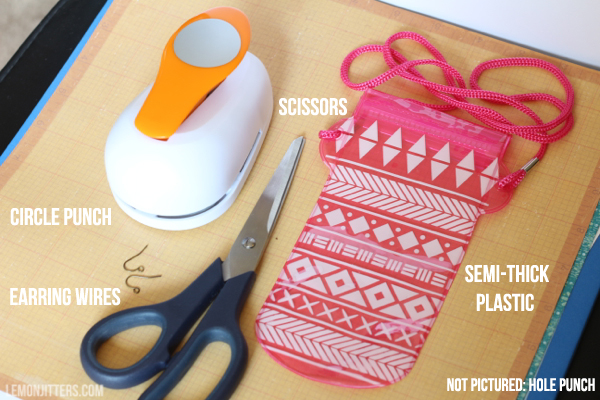 Supplies: Circle craft punch (this one is about 1.75 inches), earring wires, scissors, some kind of semi-thick plastic with a design and a hole punch. Optional (not pictured): alcohol inks.