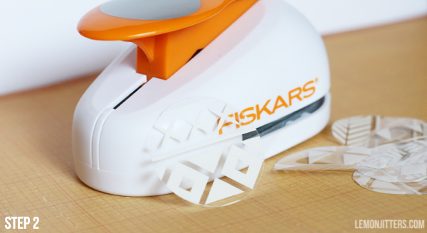 Step 2: Use your craft punch to cut out as many shapes as you can fit onto the piece of plastic you are working with. I wasn’t too specific about where I punched on the design – I mainly focused on getting an even number of circles. I matched the designs after I had the circles punched out.