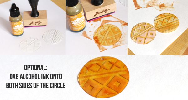 Optional: Dab or swipe alcohol ink onto the circle. As you can see in the top right image, I tried different techniques. I inked just one side and then just the other side. I decided I liked the look of inking both sides – it gave the most vibrant color.