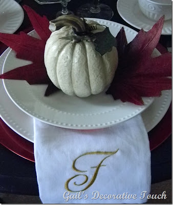 isn’t Gail’s table setting lovely? love the white pumpkin.