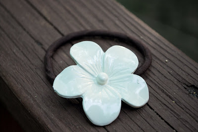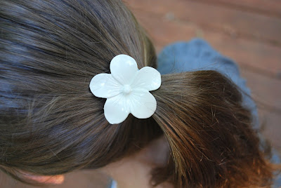 i love something pretty for my hair. and i am definitely a pony tail girl. {it’s a mommie’s best friend, right?} and i’ve been seeing a few dressed up hair elastics and thought i’d make my own using a necklace pendant that a friend gave me for my b-day.