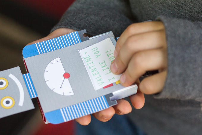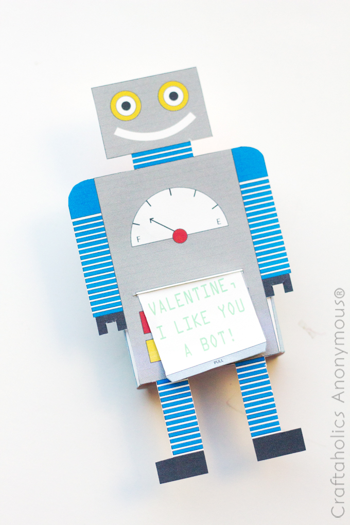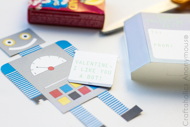 My kids loved that they had to pull out the little card to read their Valentine message! They were so excited about this little robot they almost forgot to devour the yogurt covered raisins (almost!) Hope your kids enjoy it as much as mine did!