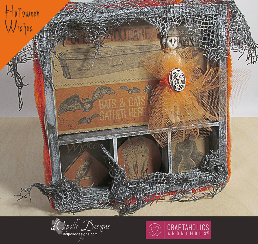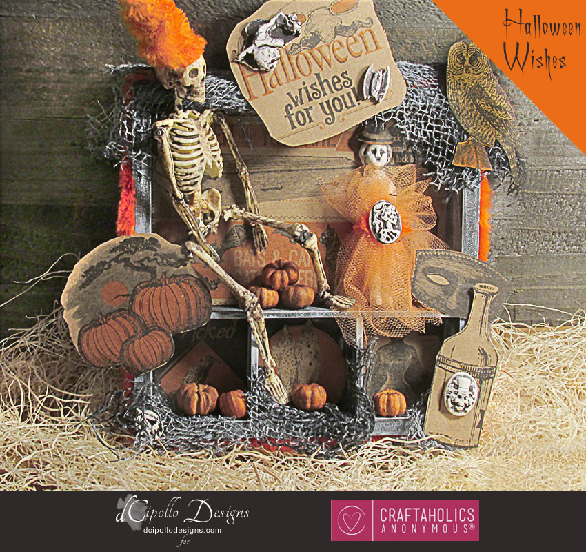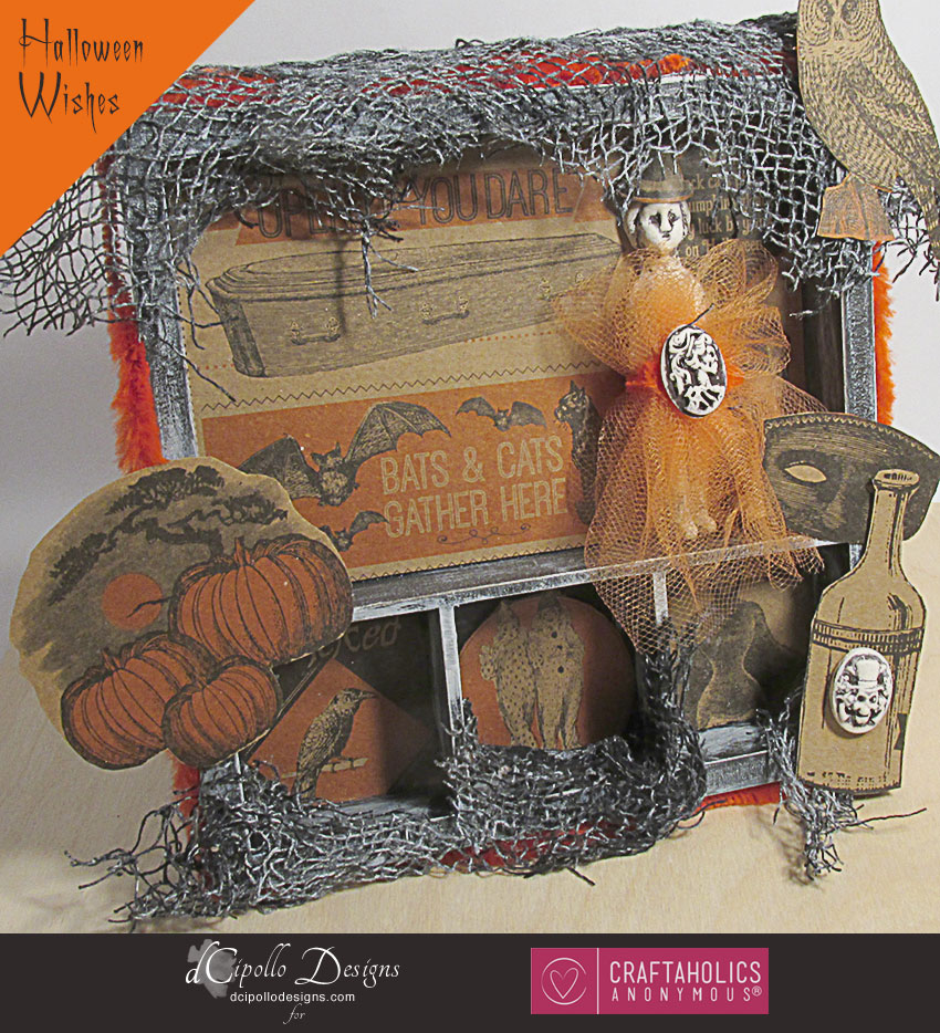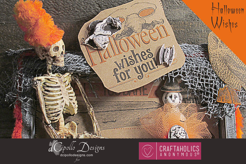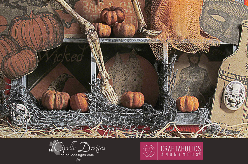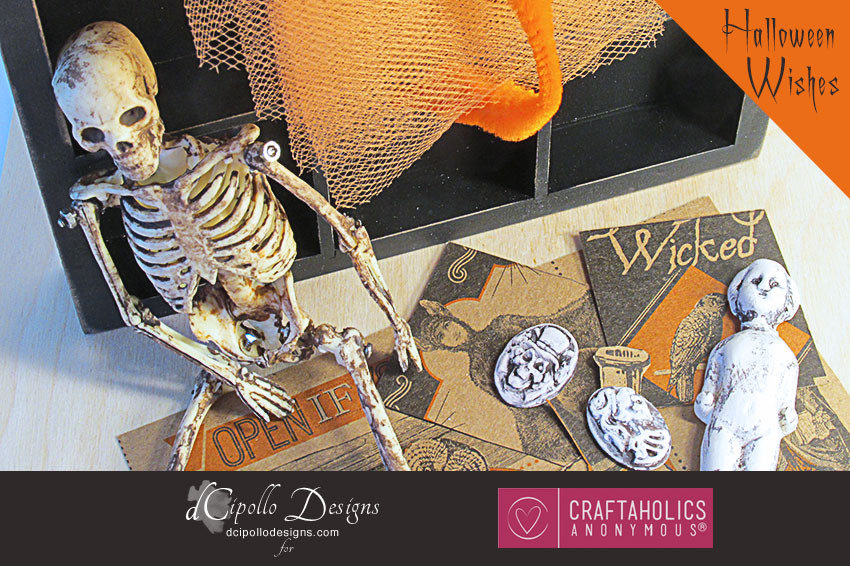 I love Halloween themed shadowbox trays and when I saw the new Haunt It Collection from Canvas Corp Brands, I knew the vintage styled tags on Kraft paper were perfect for my next project. I had just purchased the Petite Pete mini skeleton and was so glad that he fit into the small 7Gypsies tray. Of course he needed a friend, so I dressed up one of my favorite antique reproduction Frozen Charlotte dolls for Halloween. Throw in a little creepy cloth, skeleton head cameos and mini pumpkin pods and you’ve got a great little Halloween tray that you can hang on the wall, use as a table decoration or just set on a shelf for that spooky night!