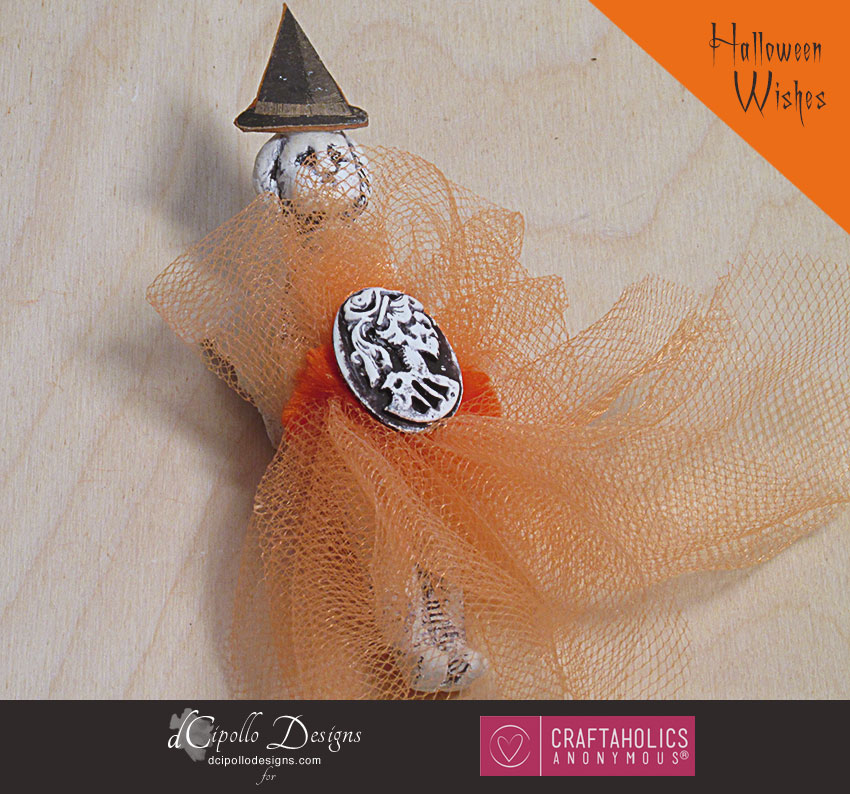 - Glue the Skeleton Lady cameo to the front of the doll’s dress over the stem.