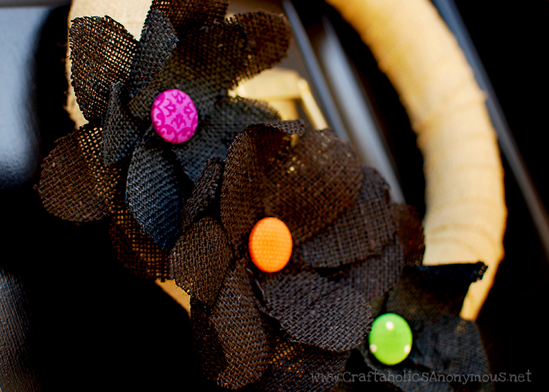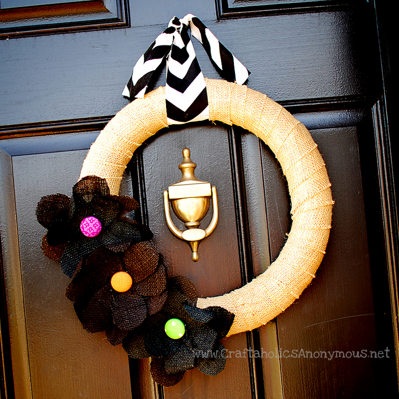 Happy monday, crafters! you are going to LOVE my newest halloween wreath!! remember that interchangeable fall wreath i made in september? well, thanks to the interchangeable feature, here is my halloween version with black burlap flowers and a chevron bow: