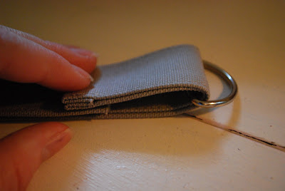 next, thread the D-ring over one side then wrap the fabric strip around overlapping the two ends about 2″ from the D-ring.