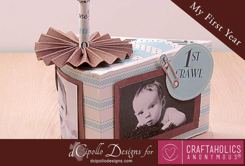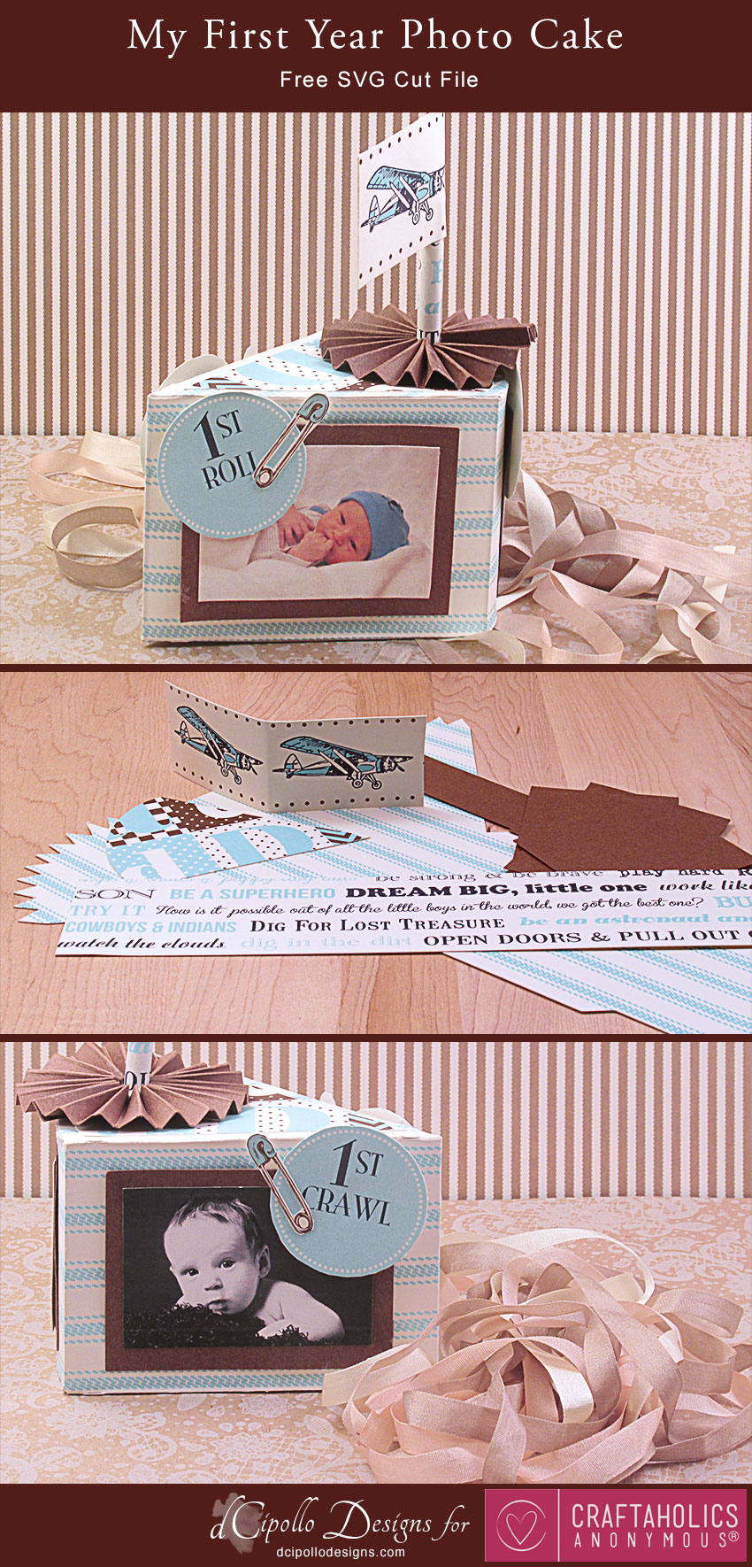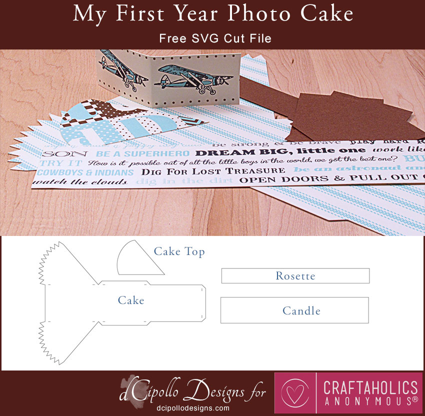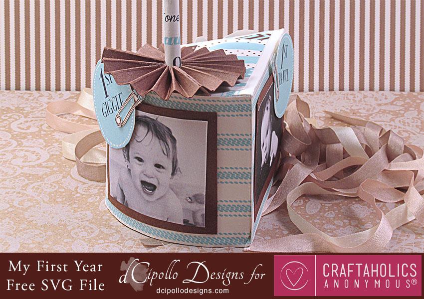 I was looking through some family photos that we’ve shared with each other on Facebook and some of the baby pictures of little Calvin were so cute that I had to make a project just for them. This SVG cut file project started as a photo cube but quickly turned in to a “My First Year” photo cake, which displays three pictures of Calvin.