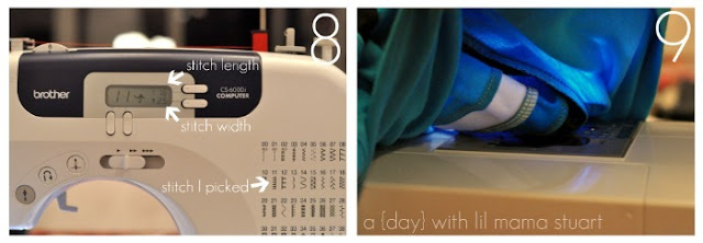 1. Pick an appliqué stitch on your sewing machine (#11 for me). Adjust your stitch width and length as desired. (Test it out on some scrap fabric to see what you like.)