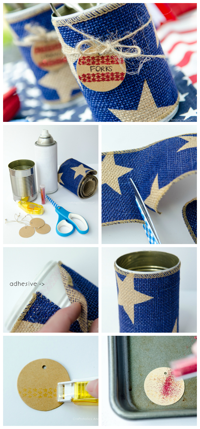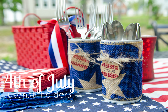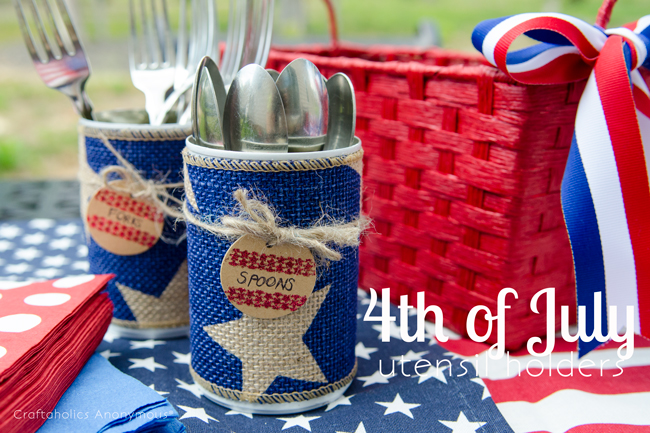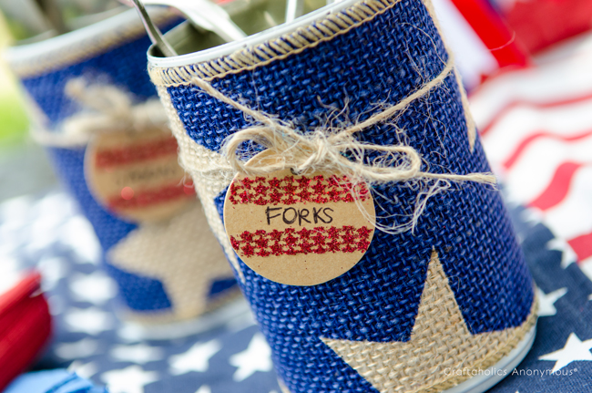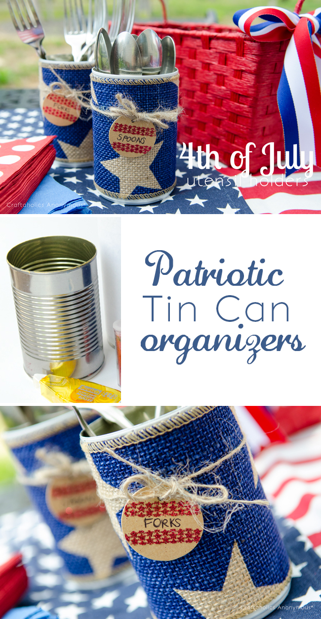 Can you believe Independence Day is Tomorrow? Crazy, I know! This summer sure is flying by. Well, if you’re in need of some last minute organizers for your BBQ and 4th of July parties, these tin can organizers are for you! Grab some burlap and tin cans and whip these up in no time for a patriotic way to organize party supplies and the like. Plus, its a great way to reuse those tin cans instead of tossing them.