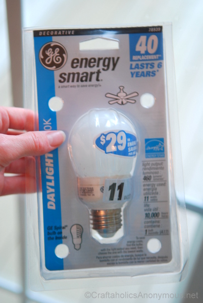 Then I replaced my incandescent bulbs with GE Energy Smart CFL bulbs to save money and save electricity. The bulbs I chose have the GE Spiral on the inside a round bulb. Which I thought was really cool and looks tons better! {i’m not crazy about the spiral look…}