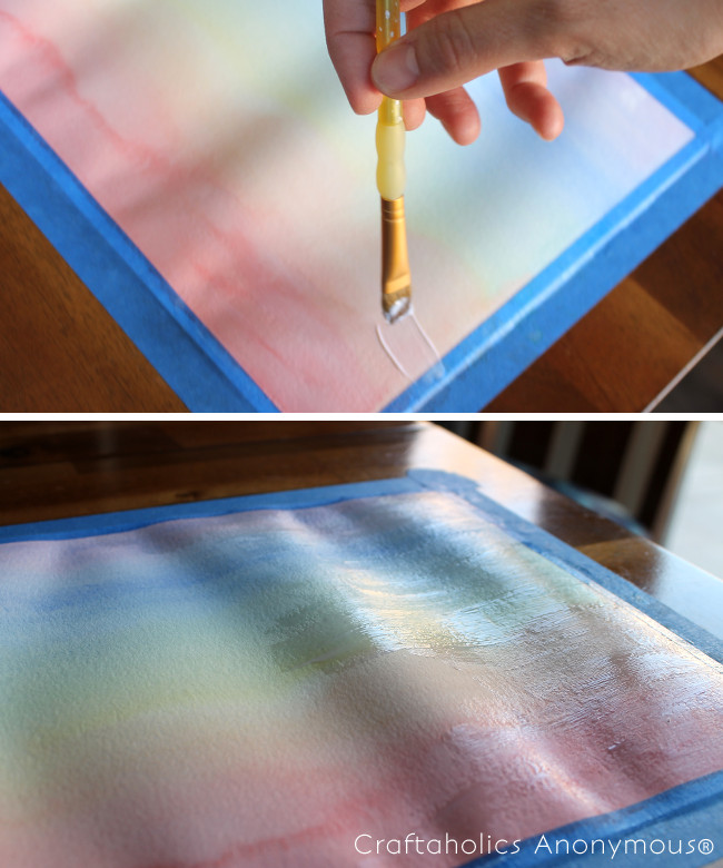 1. Once you have collected everything, it’s time to prepare your paper and colors. Tape your paper to your table using the painter’s tape. This will minimize warping of the paper and give you a nice, crisp edge around your painting.
