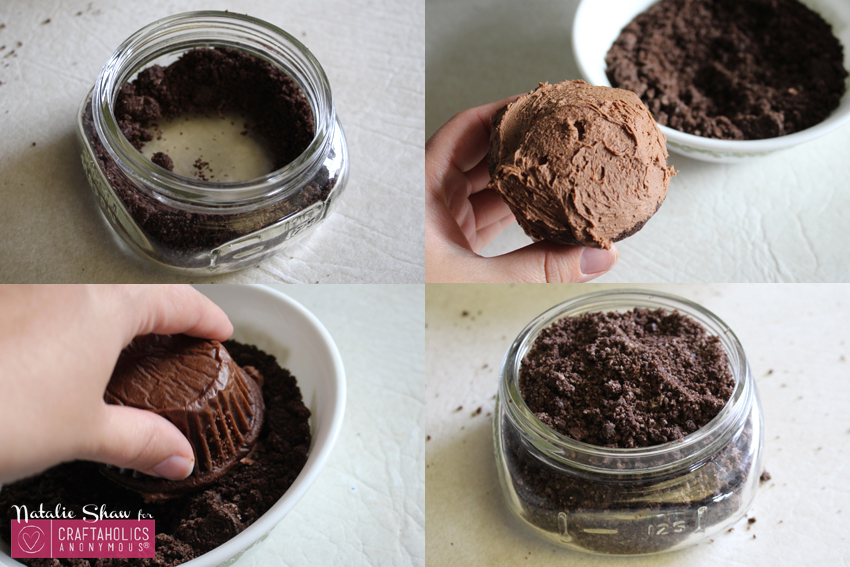 Pour some chocolate cookie crumbs in a mason jar.