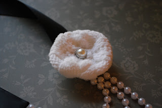 I bought a sweater at a thrift store and cut it apart to make the flower. Then added some ribbon and pearls, and there you go.