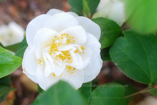 Two of these snowy white camellia bushes replaced the shrubs by our front door that Hurricane Irene took out last fall. The blooms are huge. As in the size of softballs.
