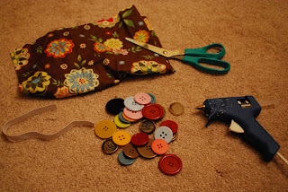 Put a line of hot glue around the outside of the button and fold over fabric. Be sure to glue down any loose corners.