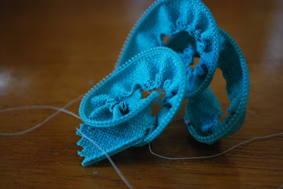 After you gather the zipper, create all your petals in a line with the zipper. then glue in place so that when you cut them apart they hold their shape. the glue is holding their shape, not the thread. the gathering is to help you get the shape you want. email me at craftaholicsanon@gmail.com if you have other questions. thanks!